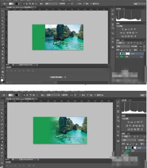 12.这一步是关键的一部,把鼠标指针放在风景素材的图片上,鼠标指针就变成了十字架形状,点击鼠标左键不要松手,然后向左侧拖动鼠标约1-2厘米,松手。你就会发现风景图片产生了与绿色背景结合的渐变效果。